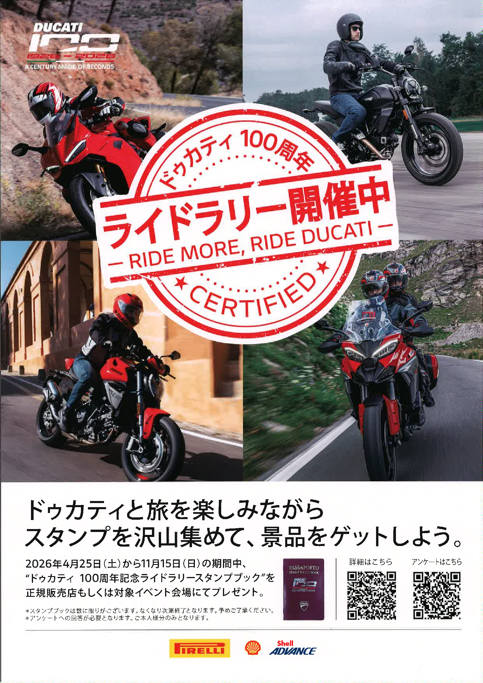 ドゥカティ100周年記念ライドラリースタンプブックを配布しております。